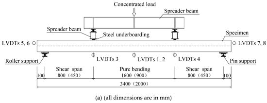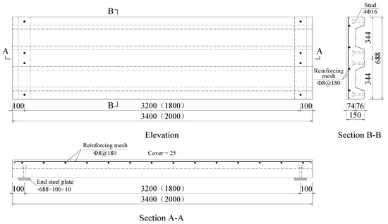 Each specimen had a 100 mm overhang at both ends. Shear reinforcement with 8 mm diameter was arranged every 150 mm in the shear span along the length of composite slab and welded to the top flange of the profiled steel sheeting by argon arc welding. The steel mesh was configured at 25 mm above the surface of the composite slab to reduce the effect of shrinkage stress and temperature stress of SCRLC (shown in Figure 4). Four shear studs with 16 mm diameter were arranged at 100 mm from the both ends of the composite slab. In order to strengthen the connection of the shear stud and the profiled steel sheeting, headed shear studs were welded to a 10 mm thick steel plate underneath profiled steel sheeting at the support of each slab. The steel plate was used to replicate the steel beam, and each plate was 688 mm long by 100 mm wide. The details of the test specimens are shown in Figure 4.
