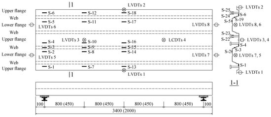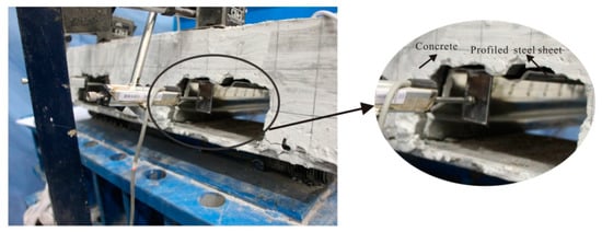 The instrumentations including a load cell (Shanghai Zhen-Dan Sensor Instrument Factory, Shanghai, China), linear variable displacement transducers (LVDTs, Jiangsu Donghua Testing Technology Co., ltd., Jingjiang, China), a hand-held microscope (Shanghai Deli stationery Co., ltd., Shanghai, China), and strain gauges (Xingtai Jinzhi Sensor Plant, Xingtai, China) were utilized in this test. The LVDTs were used to detect the deflection of slabs and end slip between the SCRLC and profiled steel sheeting at both ends of the slabs. The position of LVDTs can be seen in Figure 5 and Figure 6. Two types of strain gauges were used in this experimentation: one was used to detect the concrete strain on the top surface of the slab, while the other one was used to detect the strain of profiled steel sheeting at the upper flange, web, and lower flange of profiled steel sheeting. The position of strain gauges can be seen in Figure 6 and Figure 7. All strain gauges, LVDTs, and load cells were connected to a data acquisition system that stored the data during testing in a computer. The widths and locations of concrete cracks were straightly measured by a hand-held microscope with the accuracy of 0.01 mm when the loading was paused.