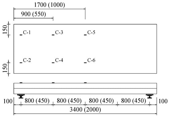 Location of strain gauges on the surface of concrete (all dimensions are in mm).