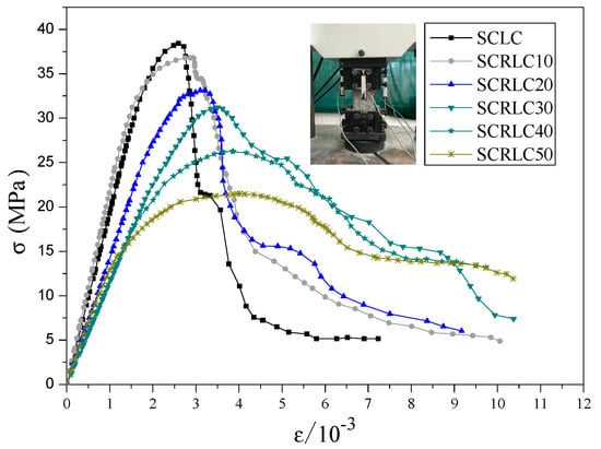 The whole curves of strain–stress under uniaxial compressive for SCRLC were obtained from experimental tests by Lv et al. [], as shown in Figure 8. After analysis, the curve Equation (1) of strain–stress for SCRLC was given as follows: