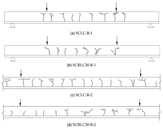 The laboratorial initial cracking load to the ultimate load ratios of four composite slabs were calculated and summarized in Table 7. For the same shear span specimens, compared with composite slabs consisting of SCLC, the composite slabs consisting of SCRLC30 had greater initial cracking load to ultimate load ratios. It meant that the anti-cracking ability under the loading of composite slabs would be significantly improved as SCRLC30 substituted SCLC in composite slabs.