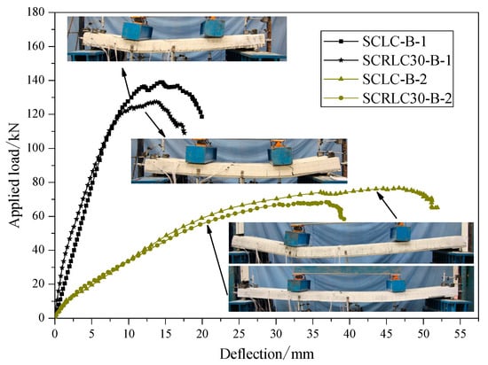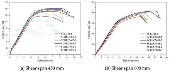The load–deflection curves of four composite slabs at mid-span are presented in Figure 11. The same shear span specimens had similar load–deflection curves. Compared with shear span 450 mm specimens, shear span 800 mm specimens had a lower ultimate load and higher mid-span deflection. For each specimen, obviously, a linear increase in deflection occurred as the applied loading was raised before the composite slabs yielded. Despite the cracks appearing on the surface of the concrete, the concrete and profiled steel sheeting still worked well together. The ultimate load and corresponding deflection of composite slabs consisting of SCRLC30 were inferior to the composite slabs consisting of SCLC regardless of short shear span and long shear span. It might be mainly attributed to the reduction of concrete strength. The compressive strength of concrete decreased from 45.6 to 33.8 MPa, which was about a 25.9% reduction ratio as the rubber particles substitution ratio increased from 0% to 30%, the variation of the ultimate load of the shear span for the 800 mm and shear span 450 mm composite slabs was from 139.4 to 128.9 kN and 76.7 to 68.7 kN, which were 7.5% and 10.4% reduction ratios, respectively. The final deflection of the composite slab consisting of SCRLC30 was less than the composite slabs consisting of SCLC, no matter whether they were the shear span 450 mm specimens or shear span 800 mm specimens.