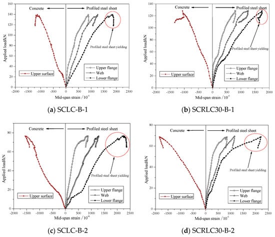 Load-profiled steel sheeting/concrete strain curves of different composite slabs at mid-span. (a) SCLC-B-1, (b) SCRLC30-B-1, (c) SCLC-B-2, (d) SCRLC30-B-2.