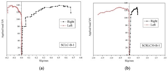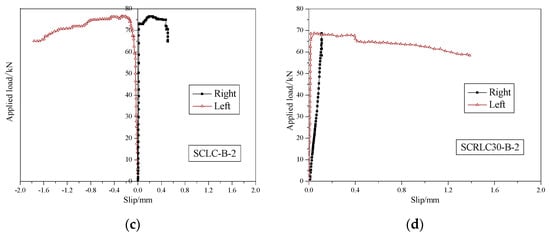 Load–slip behavior of different composites slabs. (a) SCLC-B-1, (b) SCRLC30-B-1, (c) SCLC-B-2, (d) SCRLC30-B-2.