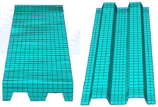 A 3D finite element model was established to account for the geometric and material nonlinearities in composite slabs. The concrete was modeled using the “8-node linear brick, reduced integration elements (C3D8R)”. The concrete performance parameters used in the finite element model were determined by materials experiments and shown in Section 3.1. The profiled steel sheeting used in the finite element model was modeled using the “4-node doubly curved shell, reduced integration elements (S4R)”. The material properties are shown in Section 2.1.2. An elastic–plastic model based on Von Mises yield criterion and kinematic hardening criterion was utilized to treat the plasticity of profiled steel sheeting. Due to small slippage between the concrete and profiled steel sheeting, a tie contact was chosen to handle the interaction effect between the concrete and profiled steel sheeting. In view of the accuracy and efficiency of finite element analysis (FEA), the global element sizes were limited to 50 mm for concrete and profiled steel sheeting and 25 mm for two supports. The finite element model of a simulated experimental composites slab is presented in Figure 16.
