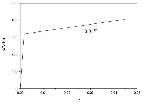 The double broken line model was used to model the profiled steel sheeting, as shown in Figure 17. The elastic module of profiled steel sheeting during the elastic stage was E = 2.06 × 105 N/mm2, while the elastic module of the profiled steel sheeting during the strengthening stage was E’ = 0.01E. The “concrete damaged plasticity” mechanical model in ABAQUS was used to model SCRLC. The compressive behavior of SCRLC was simulated by the compressive stress–strain relationship, as shown in Equation (1). The tensile behavior of SCRLC was simulated in accordance with the Chinese Code for the design of concrete structures (GB50010 2010), as shown in the following Equation (2).