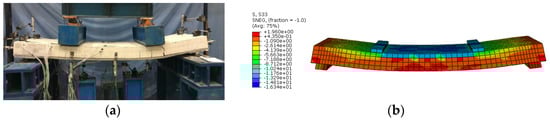 For verifying the accuracy and effectiveness of the finite element model, the numerical results were contrasted with experimental results. Figure 18 exhibited the failure modes of test and FEA for composite slabs. It can be seen from Figure 18b that the upper composite slab was in compression while the lower composite slab was in tension, which was in line with the experimental results. The FEA failure mode was also quite similar to the test failure.