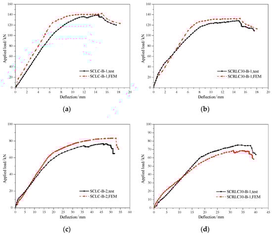 Comparison of load–deflection curves of composite slabs at mid-span between tests and FEA. (a) SCLC-B-1, (b) SCRLC30-B-1, (c) SCLC-B-2, (d) SCRLC30-B-2.