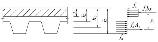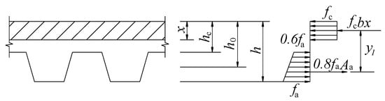 According to JGJ138-2016 [], the calculating diagram of the flexural capacity of composite slabs is shown in Figure 21, while the ultimate bending moment of composite slabs could be calculated by Equation (3).