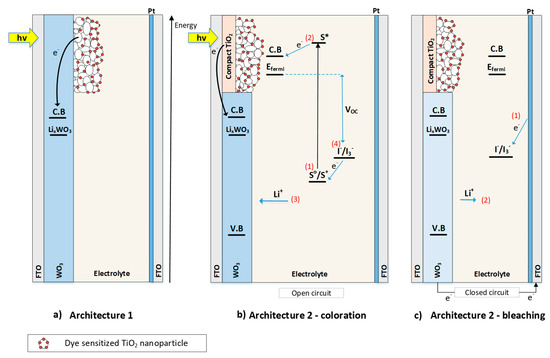 The operation of these devices is as follows: incident light is absorbed by the dye (step 1—Figure 1b), electrons move to an excited state and are injected into the conduction band of TiO2 (step 2—Figure 1b). Next, the electrons are injected into WO3, either directly (architecture 1, Figure 1a), or through the FTO substrate, (architecture 2, Figure 1b). They then diffuse into the EC layer, which becomes negatively charged and Li ions intercalate into it for charge equilibration (step 3—Figure 1b). Thus, the WO3 film is colored.