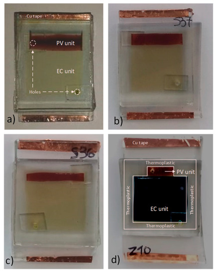 The fabricated PEC devices had dimensions of 3.0 cm × 4.0 cm and were of architecture 2, as described in Section 1.1. The anode and the cathode were placed so that their conductive surfaces faced each other. Furthermore, they were slightly displaced in order to preserve space for the electrical contacts, as seen in Figure 2. In order to effectively seal the apparatus, we used Syrlun (by Dyesol, with a thickness of 50 μm). The thermoplastic material was cut in the desirable shape and dimensions and was placed between the two electrodes. It served two purposes: (a) the definition of the device active area and (b) the creation of the space needed between the electrodes in order to insert the electrolyte afterwards (see Figure 2). Heating at 120 °C for 12–15 min followed in order to melt the thermoplastic. The pouring of the electrolyte was done through one hole, while the air leaked through the other. Finally, the two holes were sealed carefully, each with a small piece of thermoplastic and glass. To ensure better grip on the two electrical contacts, copper adhesive tape was used. The completed devices appear in Figure 2.