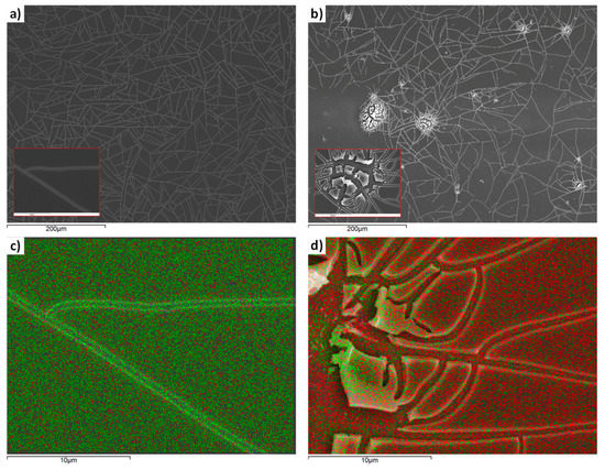 These cracks, however, do not reveal much of the substrate, as can be seen in the EDS material analysis of Figure 3c. The film annealed at 500 °C also exhibits extensive cracking, as can be seen in Figure 3b, with regions where the FTO substrate is not covered by TiO2, as follows from the EDS material analysis shown in Figure 3d. XRD measurements, appearing in Figure 4a, reveal that the film annealed at 400 °C is amorphous, while that at 500 °C is crystalline with characteristic peaks of anatase [17].