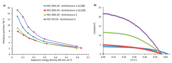 (a) Photocoloration efficiency vs exposure energy density for two PEC devices with architecture 1 and 20% cover ratio (CR) from our previous works, and two devices with architecture 2 and 20%, 5% CR and (b) J–V curves of these devices.