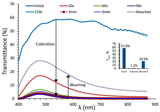 The inset shows the luminous transmittance values for the corresponding initial, fully colored and bleached states of the PEC device. It follows that the optical behavior of the device is similar to that of devices with architecture 1, presented in our previous research [9,28,29,30], with a 44.5% contrast ratio between the initial and fully colored states, which is among the highest contrast ratio values presented in our previous work. Thus, the reduction in cover ratio does not appear to impede optical properties.