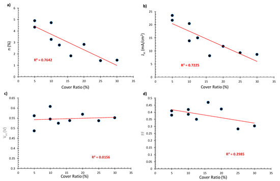 In Figure 7, the PCE, JSC, VOC and FF values versus the cover ratio of the devices are presented. It can be observed that, with a decreasing CR, the PCE increases.