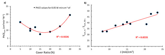 However, as the cover ratio decreases below 15%, an interesting phenomenon occurs: the PhCE values show an upward trend, reaching a maximum of approximately 15 cm2min−1W−1 for 5% CR. This probably occurs because, as seen in Figure 7a the PCE values increase with the decreasing cover ratio, due to the increase in the photocurrent density, as shown in Figure 7b. Thus, for cover ratio values below 15%, the factor with the highest significance regarding photocoloration efficiency appears to be the PCE of the PV unit, whereas above 15% would be the area ratio between the PV and the EC films.