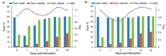 A considerable improvement can be observed in Figure 9b. Therein, the device stored in SC conditions exhibits a Tlum, initial value equal to 57% and Tlum, bleached equal to 56% on the first day of fabrication. As a result, reversibility occurs by only one day post fabrication, and the device remains reversible in the following days of testing. In both devices from Figure 9, variations in the PCE can be observed, which are due to changes in the electrolyte composition [9,28,30]. The PCE seems to stabilize to values just above the initial value η0. We can therefore conclude that storage of the devices in either OC or SC conditions does not seem to cause degradation in the DSSC.