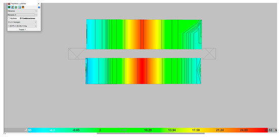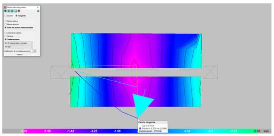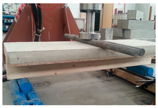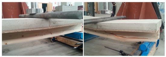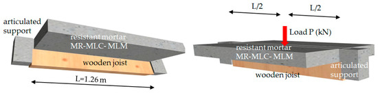 Subsequently, the mechanical behavior of the mixed slab was studied under working stress, assessing the strength of the composite wood–mortar slab. Its assessment was through a comparison with the theoretical simulation model, using the real values obtained from the failure tests, and verification of the safety reserve that guarantees system stability.