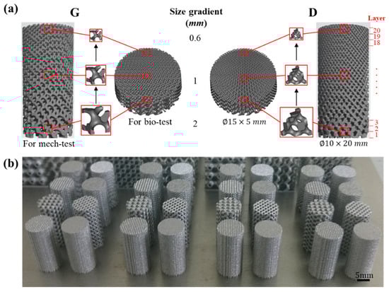 The porous scaffolds studied in this work were designed using the ISM method according to our previous study []. Two types of porous units, i.e., Gyroid (G) and Diamond (D), were constructed in MATLAB software (R2014a, MathWorks, Natick, MA, USA), and their program codes are shown in Supplementary Materials. Then Magics software (20.03, Materialse, Leuven, Belgium) was used to scale and refine the CAD files. All of the samples studied in this work fall into two categories based on their experimental use, one for mechanical performance tests with dimensions of ϕ10 × 20 mm and the other one for biological experiments in vitro with dimensions of ϕ15 × 5 mm, as shown in Figure 1a. Figure 1b shows a portion of the as-built samples fabricated by SLM.