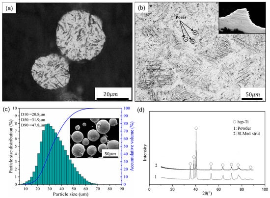 Optical micrographs of (a) the powder and (b) a strut cross section, (c) particle size distribution and SEM image of the Ti-6Al-4V powder, and (d) XRD patterns of the powder and SLM produced strut.