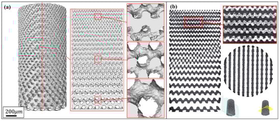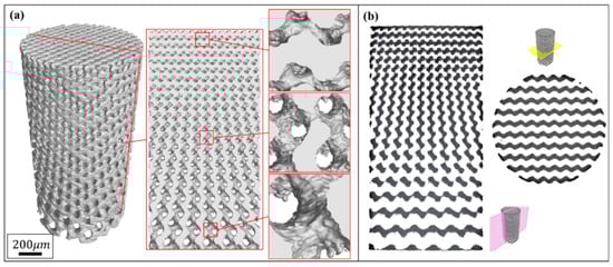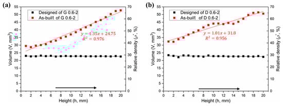 where ΔV = V1 − V0, i.e., the difference of volume between the as-built and designed models. S0 represents the surface area of designed model, and δ is the nominal thickness of increased volume. The δ values for each layer of the Gyroid and Diamond structures are listed in Tables S1 and S2 of Supplementary Materials, respectively. It was found that δG and δD are very close, calculated as δG = 66.3 ± 17.1 μm, δD = 68.7 ± 6.8 μm, giving no significant deviation; accordingly, the total average is δ = 67.6 ± 12.9 μm, which can used to predict the geometric characteristics of the porous scaffolds for future application of biological transplantation. Thus, this invariable thickness is multiplied by the surface area that linearly increases along the Z-axis, resulting in a linearly increased volume, as shown in Figure 7a,b.