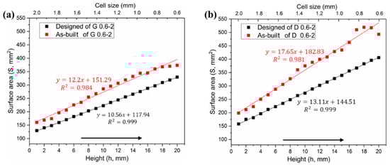In theory, the cell-size gradients studied in this work have a uniform relative density in all layers, which was confirmed by the two horizontal lines in Figure 7a,b. However, the volume in the as-built model shows a linear increase in the height direction, as similar to the surface area. It has been also found in a study [] that the relative density and volume fractions of the SLM cellular parts are higher than those designed ones, due to the increase of the strut and the bonded powder particles.
