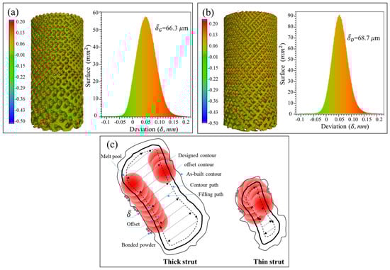 In the SLM process, the laser scanning includes center filling and contour path generation according to the part geometry, as shown in Figure 6b from G struts. Owing to the influence of the laser spot with Gaussian heat source, it forms a heat affected zone of a certain width during scanning, which enables the powder at the contour boundary to be partially melted and resultantly attached to the solid interface []. Some powders are also adsorbed by the molten pool, solidified and bonded to the surface of the final part. It is these irregular morphologies and roughness of strut surfaces that increase the surface area and volume of the original designed part [].