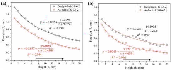 Comparative analysis of pore size distribution between designed and as-built models, (a) Gyroid gradient porous structure, (b) Diamond gradient porous structure.