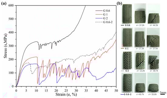 Sets of compressive stress–strain curves of Gyroid and Diamond structures are depicted in Figure 9 and Figure 10, respectively, along with their video frames under compression. In contrast, the uniform structures tend to present a severe drop in strength associated with shear collapse, and a smaller unit leads to a higher stress curve, while the gradient structure underwent sequential layer collapse from the bottom up, showing a significant plateau stress without a severe drop.