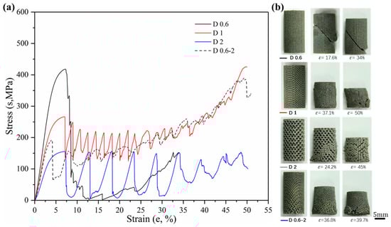 Porous samples with dimensions of ϕ10 × 20 mm were subjected to uniaxial compressive tests using an MTS servo-hydraulic machine (MTS Systems Co., Ltd., Shenzhen, China) with a 100 kN load cell. The loading rate was set at a cross-head speed of 1.5 mm/min, recorded by a digital camera to keep track of their deformation behaviors. Three sets of repeated experiments were performed under the same normal condition according to the ISO 13314:2011 standard []. In this study, elastic modulus (E) was defined as the slope of stress–strain curve within the elastic deformation region, yield strength (σs) was measured as the compressive 0.2% offset stress, and ultimate strength or collapse strength (σb) was determined as the stress at the first peak on the stress-strain curve.