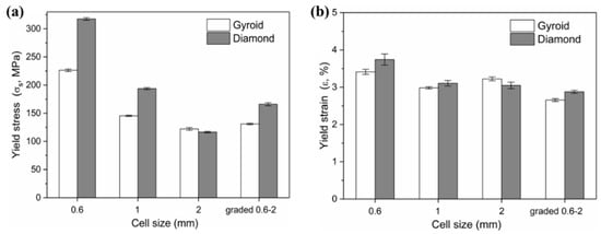 (a) Yield stress and (b) corresponding yield strain of Gyroid and Diamond scaffolds with cell size ranging from 0.6 to 2 mm.