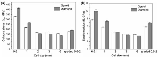 Comparison of (a) collapse stress and (b) elastic modulus of Gyroid and Diamond scaffolds with cell size ranging from 0.6 to 6 mm, where cell size of 3 and 6 mm are based on Reference [].