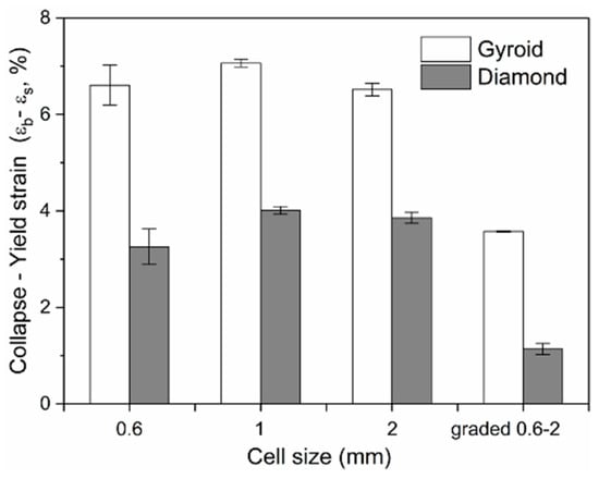 Comparison of the collapse–yield strain (εb − εs) of Gyroid and Diamond scaffolds with cell sizes ranging from 0.6 to 2 mm.