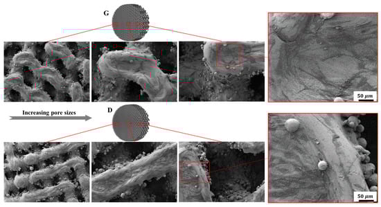 After being cultured for 2 days, SEM was employed to observe cell adhesion on different substrates. It can be seen from Figure 14, that both the Gyroid and Diamond scaffolds display impressive cell attachment with increasing pore size. It is noteworthy that cells uniformly attach and spread on the surface of the scaffolds from the outside to inside, irrespective of the architecture and pore sizes of the scaffolds, due to their interconnected porosity inducing the attachment of bone cells. As is known, favorable cell adhesion is crucial for the survival of an implant [], since it is beneficial to the subsequent biological events, for instance, cell spreading, proliferation, differentiation and eventually tissue formation [,]. The SEM images show that cells survived well on both Gyroid and Diamond scaffolds, indicating that the porous samples facilitate an ideal growth environment for osteoblast growth.