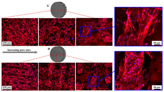 Fluorescent microscopy was employed to further investigate cell morphology on the substrates. As shown in Figure 15, osteoblasts homogeneously spread along the struts of the scaffolds. It is worth mentioning that cells displayed elongated cytoskeletons with distinct spindly filopodia anchoring to the struts and oriented ordered arrangements along the frameworks of the scaffolds. Additionally, more cells adhered to the surfaces of the scaffolds with smaller pore sizes compared to the larger ones, which could be ascribed to the larger surface area and lower permeability coefficients []. Although a larger pore size provides ample space for nutrient–waste exchange and vascularization, the small pore porous structures with more surface area exhibit superior cell adhesion in the early stages of tissue growth. As mentioned in some reports [,], a higher mean curvature within a smaller porosity can induce more tissue proliferation in vitro. For the same structure with different pore sizes, the average curvature of the pores is inversely proportional to the pore size, and the smaller pore structure has a higher surface curvature, thus more cell adhesion occurs on the smaller pores of a stent. It was recognized in [] that the higher cell seeding efficiency in the smaller pores is due to their lower permeability, which reduces the average fluid velocity and prolongs the stay time of the cell suspension within the scaffold, resulting in the facilitation of cell growth attached to the surface.