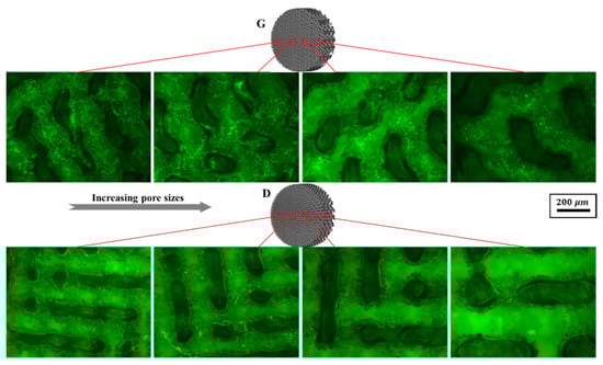 Nevertheless, it should be noted that fully interconnected pore architecture is an essential factor to facilitate tissue in-growth. And it was recommended that the pore size of scaffolds should be in a range of 300 to 900 μm, which is suitable for bone regeneration [,]. In the discussion of the pore distribution in the previous Section 3.1, the CT model showed that the pore size of the Gyroid scaffold varies from 283 to 1092 μm, and that of the Diamond scaffold ranges from 217 to 950 μm, which is associated with continuous gradient architecture similar to natural anatomical bone. The cells were homogeneously distributed in the gradient structure and showed metabolic activity similar to that of bone cells, which demonstrated that cells were evidently viable in the graded structures.