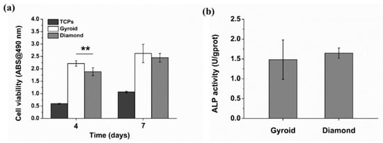 The cell viability was evaluated by FDA staining (Figure 16). Green fluorescence indicates living cells. It is noteworthy that osteoblasts covered on the surfaces of the scaffolds, while Gyroid scaffolds displayed higher cell density than the Diamond scaffolds. In addition, the cell viability was further quantified by MTT assay. With reference to Figure 17a, cells proliferated steadily over time; likewise, the cell viability on Gyroid scaffolds was higher than that on Diamond scaffolds at all times. Especially on the 4th day, there was a significantly higher cell viability (p < 0.01) on Gyroid scaffolds by contrast. The results indicated that scaffolds with gyroid cell structures were superior for osteoblast growth, which could be attributed to larger surface area for cell penetration and satisfactory medium fluid throughout the porous architectures. With respect to cell differentiation, ALP activity measurement after incubation for 7 days indicates there was no significant difference between the two scaffolds (Figure 17b).