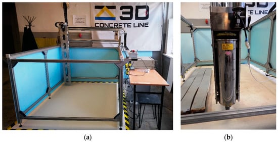 A custom 3D printer, with the kinematics of a cartesian coordinate robot [30], was used to print the specimens used for the shrinkage testing. Its working area in the horizontal plane is around 145 cm × 145 cm, whilst in the vertical plane, it is 90 cm. As presented in Figure 1, two printing modules can be connected to it: a pump for constant printing and an extruder for smaller print jobs of up to seven litres. The tests reported in this paper were undertaken using the extruder module. The printer was steered using a G-code. The nozzle used had a circular cross section of 20 mm. The print head operated at a constant speed of F = 3000 mm/min, with a constant extrusion rate of 1.58 L/min.