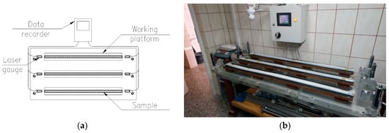 Throughout the entire testing procedure, the specimens produced for the purposes of shrinkage testing were placed on a layer of foil, which was situated on the working platform. At the end of the printing procedure, excessive material was removed from the extruded samples so as to adhere to the desired sample length of 1350 mm, after which the reference points were installed. Next, the specimens which were to harden underneath foil were hermetically sealed in it, with care taken so as not to cause any deformations. All the specimens were immediately transferred to the environmental chamber, at which point—after installation of the reference points—the process of deformation measurement began.