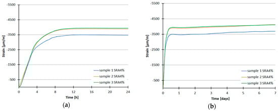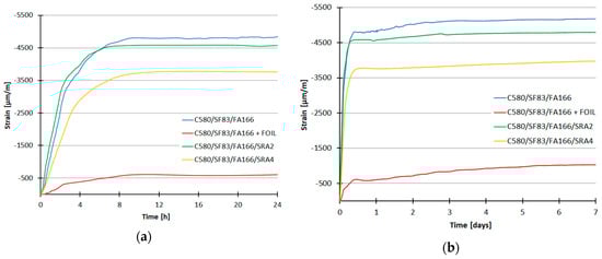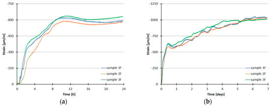 The cured specimens were measured for seven days. Further measurements were not carried out because deformations ceased to appear after the first week of maturation. The maximum average deformations, in the specimens where drying was minimised via foil isolation, measured −1031 µm/m. Scheme 2a,b presents the progression of deformations caused by shrinkage of the mix in the first 24 h and after seven days, with the standard deviation not exceeding 78 µm/m.