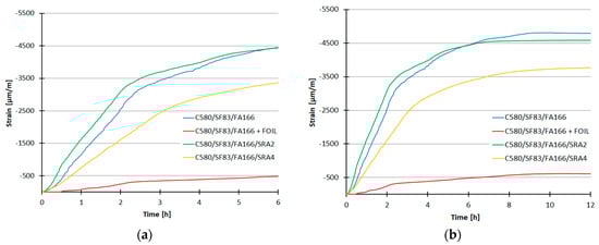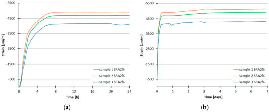 The deformation growth rate in the base concrete, as well as in that with added SRA, was clearly suppressed in the first 24 h of measurement. This is a point in time at which the hardening of a mixture has finished and when the cement matrix is so compacted that there is no more moisture loss. A very small increase in deformations, resulting from autogenous shrinkage in the material, can be observed between the first and seventh days of measurement. The gradients of all of the graphs are convergent, which confirms that the cause of deformation was autogenous shrinkage (to a large extent dependent on the amount of binder in the mix [38,39,40]).