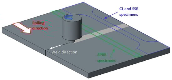 Schematic representation of specimens obtained by means of friction stir welding (FSW) welded sheet (draw not in scale).