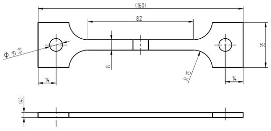 CL tests were carried out on a specimen of 4 mm × 8 mm × 82 mm gage length, with the weld positioned at the center of each specimen (Figure 1). The size of the specimens is reported in Figure 2. The specimen was settled in a double compartment cell (Figure 3a). All the compartments were maintained at room temperature filled with aerated NaCl 35 g/L solution (Carlo Erba RPS analytical grade reagents, Cornaredo, Italy). Water recirculation in the cell was granted during the tests. The OCP of the specimens was continuously monitored using a SCE positioned close to the metal surface by means of a Lugging capillary.