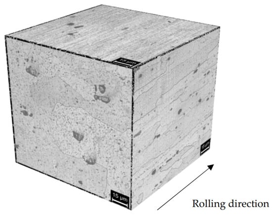 The microstructure of the AA 7075 T6 alloy has already been presented in [26]. Coarse precipitates along the grain boundaries (Figure 4) and micrometric precipitates within the grains of α-Al, oriented in the rolling direction [28], can be well demonstrated. The strengthening MgZn2 nanoprecipitates are not visible under the optic or SEM microscope, while macro-precipitates are copper and iron-rich phases as Al2CuMg and Al7Cu2Fe or zinc and magnesium rich phases, i.e., undissolved MgZn2 during alloy solution annealing treatment, or MgSi.