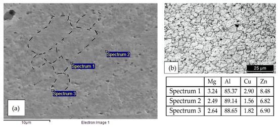 (a) SEM image of the nugget of the FWS 7075 alloy (no metallographic attack) the rounded recrystallized grains are visible owing to the precipitates of MgZn2 on their grain borders and EDX spectra in which is visible an enrichment of zinc and copper in the correspondence of the precipitates. In the image the grain border is demonstrated; (b) optical image of the nugget with metallographic attack (Keller’s reagent) that better demonstrated the rounded recrystallized grains.