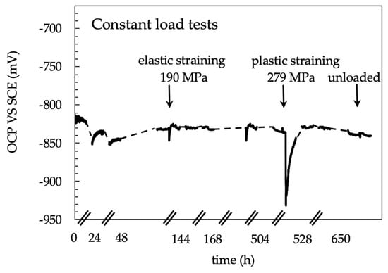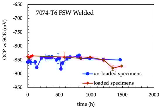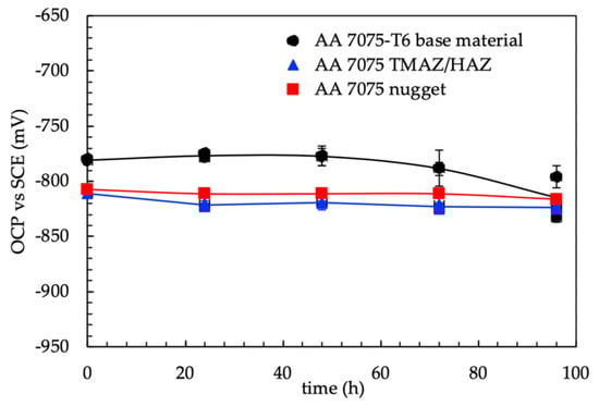 The OCP measurements (average values of four specimens) did not show any evident differences between 4PBB loaded and unloaded specimens (Figure 7). The corrosion potentials generally were in the range of −870–−840 mV vs SCE; the corrosion potential showed a sharp decrease during the solution refresh owing to the partial removal of non-adherent scale of corrosion products that exposes the corroded surface on the fresh solution; after this, the corrosion potential increases to the same potential values detected prior to the partial substitution of the testing solution. This effect was more marked for specimens without loading compared to loaded specimens. The corrosion potential of the loaded specimens decreases after 1300 h, then it increases again. Compared to the values obtained by the analysis of the three different zones (nugget, TMAZ/HAZ and base materials—Figure 8) similar results can be outlined in both the TMAZ/HAZ and the nugget. The base metal showed slightly nobler potential values.