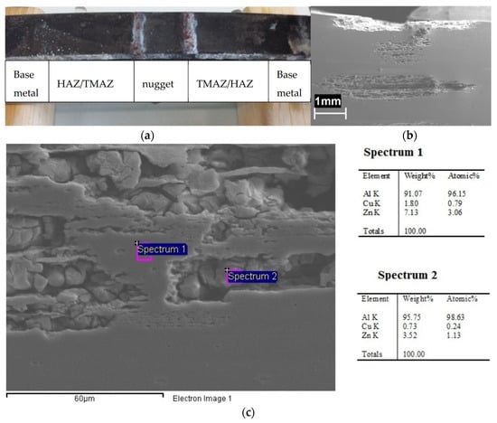 Figure 18a reports the hardness profile of the longitudinal section of the weld. The hardness sharply decreases at the TMAZ/HAZ and, therefore, the plastic deformation mainly occurs at this point, thus decreasing the total elongation at break and the time of failure. Despite the high strain rate due to plastic strain localization at TMAZ/HAZ, slight decrease in the time to failure in 0.6 M NaCl solution was noticed compared to air—i.e., 10 ± 0.5 h—thus denoting SCC occurrence. Bala Srinivasana et al. reported about SCC phenomena in the HAZ of the AA7075 of mixed FWS joints of AA7075 and AA6056, when the specimens were tested at strain rate 10−7 s−1 in NaCl solutions, but only localized corrosion in the tests carried out at 10−6 s−1 was detected [36]. The SEM observation of the surfaces demonstrate a flat zone at fracture initiation with maximum depth of 1 mm (Figure 18b,c). The presence of non-coherent corrosion products of aluminum and several precipitates was also noticed (Figure 19a). EDX analysis detected the presence of zinc, aluminum, and copper, as well as magnesium depletion (Figure 20). The final fracture is by shearing (Figure 18b) and its morphology is characterized by elongated dimples and a few brittle areas Figure 19b), similarly to the base material (Figure 16).