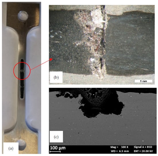 Aspect of the specimen at the end of the constant load test. (a) Macro image: the dark zone in the central part exposed to the NaCl 0.6 M solution; (b) close-up of the red circle with the selective attack of the TMAZ; (c) metallographic section of localized attack.