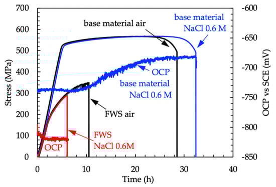 Figure 13 reports the load and OCP measurements performed during the SSR tests of the AA 7075-T6 base materials and the FSW joints. The tests were twice repeated, but only one curve for each condition is reported in the graph for simplicity. The tensile curves of the base material and the weld obtained in air or in NaCl 0.6 M are practically overlapped. The time to failure of the base material is close to the mean value with a very small deviation of 7%. 25% deviation was observed for the welded specimens. No stress-corrosion crack occurrence was noticed for the base metal and the time to failure in 0.6 M NaCl solution is even longer compared to the value measured at air. The role of active corrosion in NaCl solution can be hypothesized to enhance dislocation mobility and thus the plastic deformation, as reported by Jones et al. [28,29]. The authors named this phenomenon anodic attenuation of strain hardening.