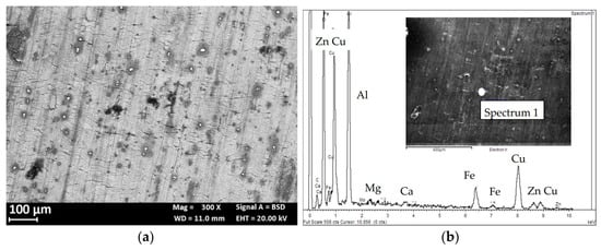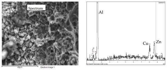 No macroscopic SCC phenomena were observed probably due to the strain rate (10−6 s−1) value adopted and very aggressive NaCl solution. Results presented in other works [30] confirmed the absence of stress corrosion on this alloy during the SSR tests at the OCP and strain rate of 10−6 s−1. The OCP remains constant in the elastic field, but it increases with the plastic deformation, probably due to the enrichment in iron and copper due to the dissolution of the surrounding aluminum matrix. This observation is supported by back-scattered electron (BSE) image and EDX spectrum (Figure 17).